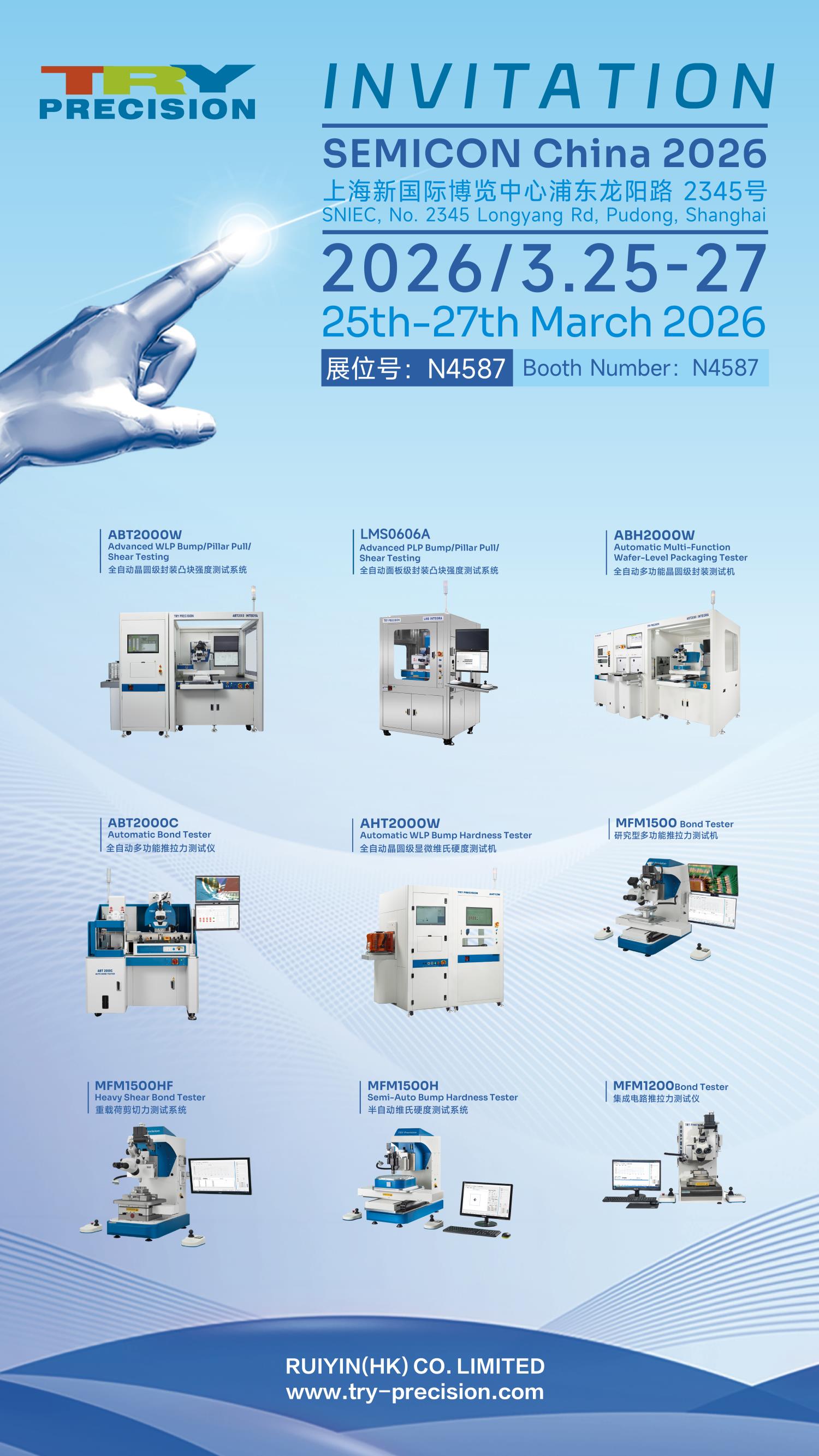 一年一度半导体行业盛会 SEMICON China 2026即将启幕,瑞茵(香港)有限公司诚挚邀请各位新老客户、业界同仁莅临展位 N4-587 交流指导。瑞茵(香港)有限公司将一如既往,为您提供专业高效、高性价比的优质产品与周全细致的贴心服务,期待与您相聚上海,共话行业新机遇!